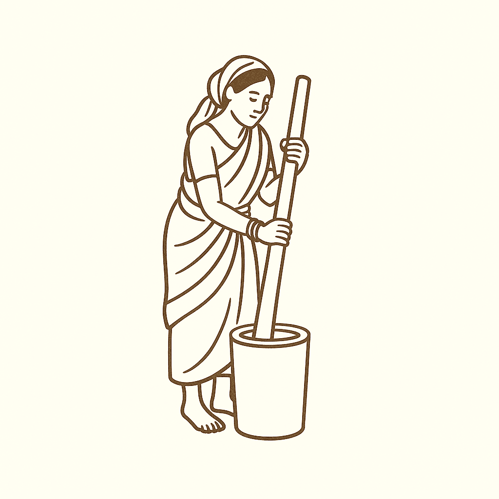 A traditional wood-and-stone pounder that naturally grinds spices while preserving their flavor and medicinal value.