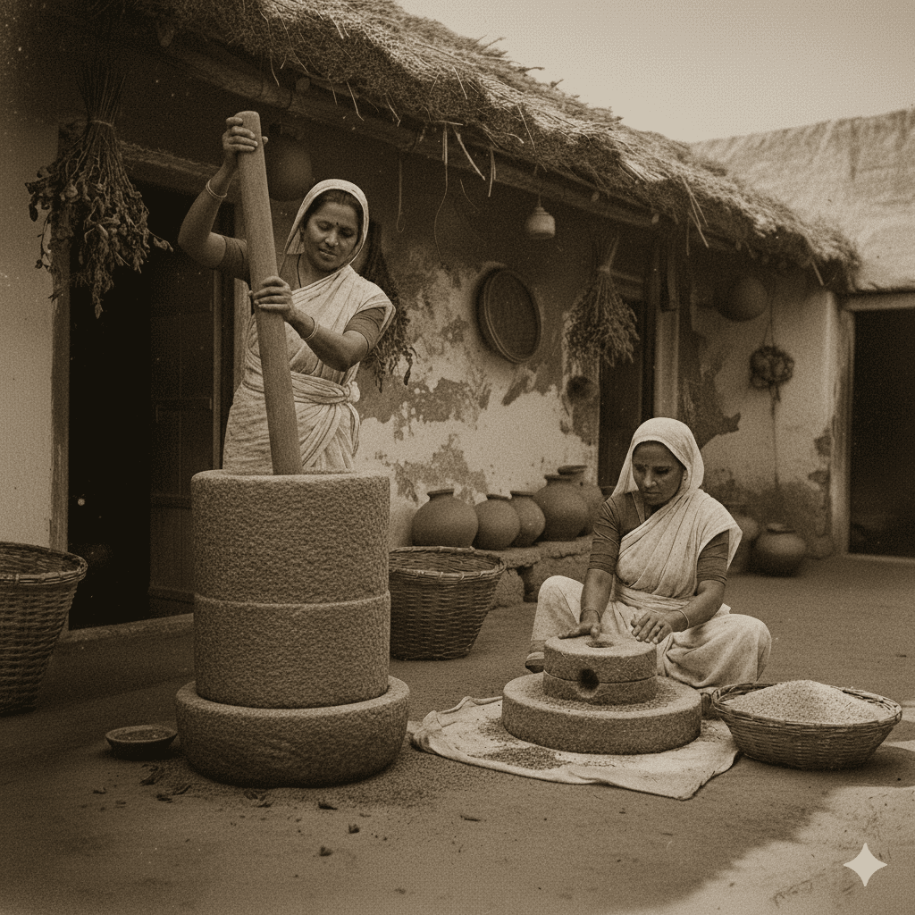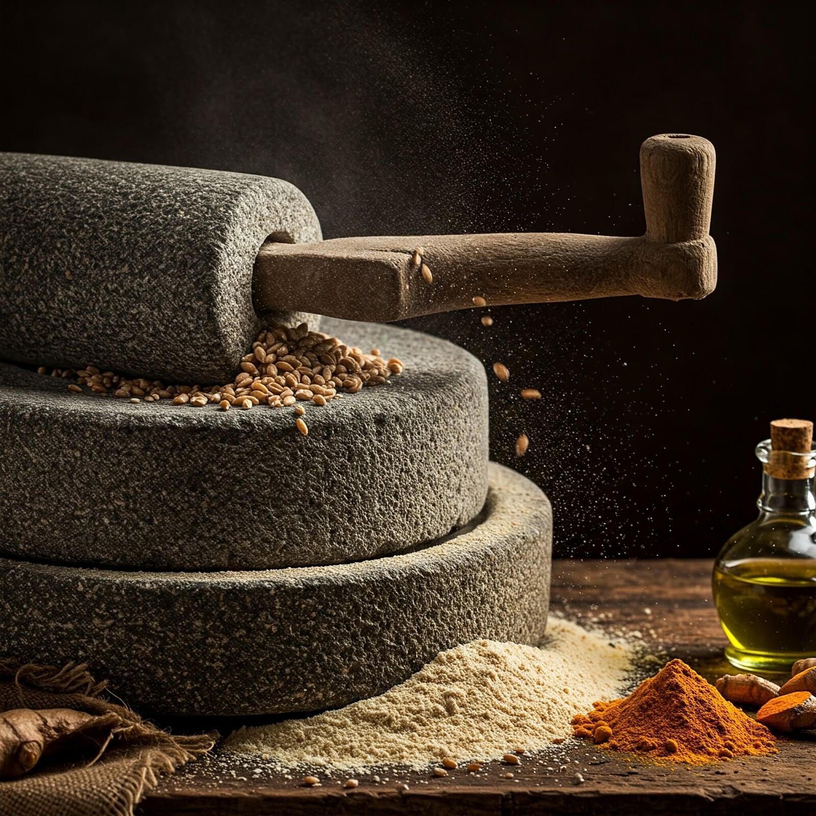 A traditional wood-and-stone pounder that naturally grinds spices while preserving their flavor and medicinal value.